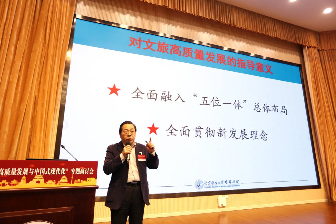 上午的主题报告由崔凤军教授主持,杨建武、黄斌、保继刚、陈向宏、宋瑞、严旭阳六位专家分别就“新时代文物的高质量发展问题”、“中国式现代化的内涵、愿景与战略路径”、“从现实问题到学术问题一一理论与实践的辩证关系”、“文旅融合的特色小镇发展探索”、“中国式现代化进程中的文化和旅游融合发展”、“中国式现代化对文旅高质量发展的指导意义”主题作了精彩纷呈报告,并和与谈人展开了智慧交锋与对话。