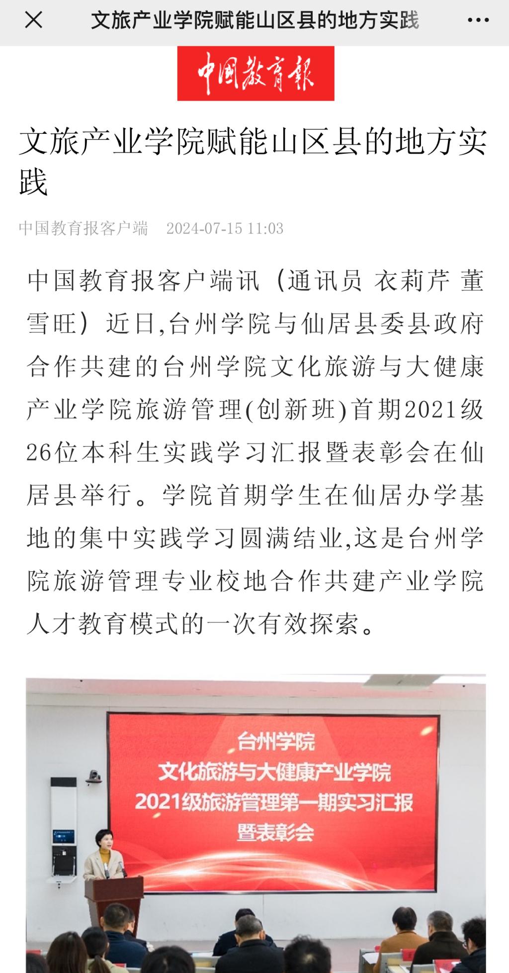 仙居县为产业学院人才培养拓展了舞台,产业学院为仙居文旅高质量发展提供了多维智力支持。威尼斯金沙欢乐娱人城旅游管理专业将继续加强“政校企行、产学研用”联动,拓宽办学思路,深入把握山区县文旅高质量发展中人才需求特征和演化趋势,不断优化培养方案,迭代式构建高水准的课程体系和教育模式,通过强化思政融入、扎根实践、数智赋能、协同创新的理念,不断提升专业人才培养质量,为地方供应可用可留的高质量应用型人才,实现校地共建共荣。