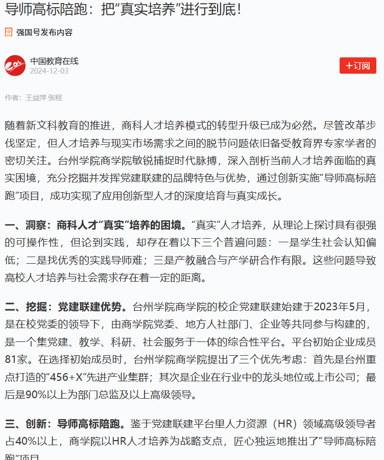 (一)构建顶尖企业导师方阵。经过广泛征集、严格筛选与精心邀请的多个环节,大型跨国企业的人力资源总监,本土龙头企业的创始人或高管都成为了导师团队成员,他们不仅具备深厚的专业背景、丰富的实战经验,而且在企业战略规划、人才管理、组织发展等方面的独到见解。